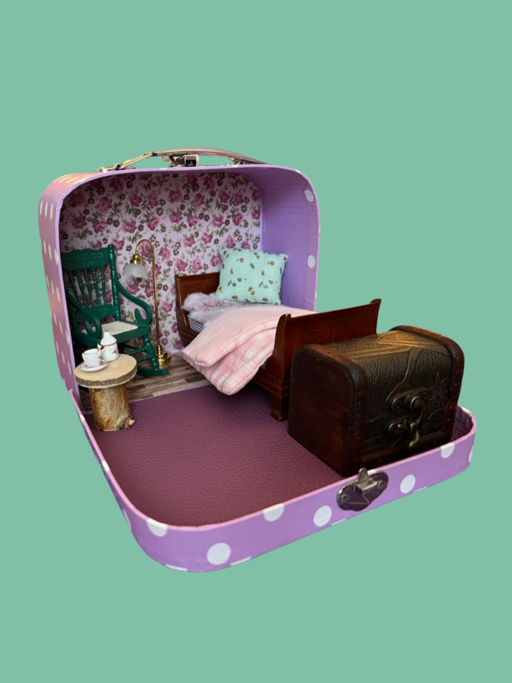 Step inside this enchanting little suitcase and discover a world where friendship blooms and imagination knows no bounds. The Tiny Friends Travel House is a lovingly handcrafted play set featuring a cozy scene . Tucked inside a vintage-style paperboard suitcase, this portable mini house invites children (and the young at heart) to dream, play, and tell stories that span generations. From afternoon tea to bedtime snuggles, every detail whispers comfort, whimsy, and care.